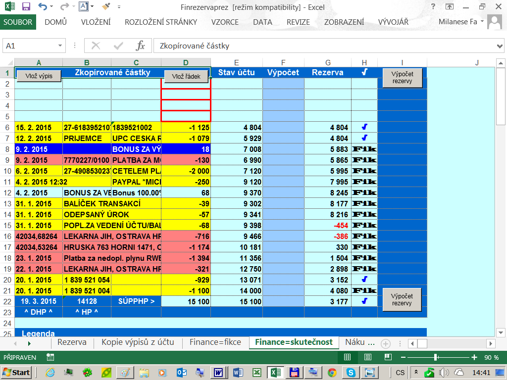 Tento list slouží k výpočtu finanční rezervy. Do sloupců tabulky se kopírují údaje z výpisu z účtu, ovšem nikoliv přímo, ale prostřednictvím listu „Kopie výpisů z účtu“, kde jsou upraveny. Údaj „Stav účtu“ se nepřenáší z výpisu z účtu, ale počítá se obdobně jako v bance: Odečítají se nebo přičítají částky ze zkopírovaných údajů. Je tak zabezpečena kontrola výpočtu, protože samozřejmě údaj „Stav účtu“ musí odpovídat skutečnému stavu na účtu v bance, což nám slouží ke kontrole vložených údajů.Udaj Rezerva ukazuje danou rezervu. Aktuální rezerva je vždy ta poslední vypočtená, tedy ta „nejhořejší“ ve sloupci G a je výrazně prezentována na prvním listu sešitu s názvem Rezerva (viz. výše). Tlačítko, Vlož výpis, slouží pro spuštění makra pro vložení údajů z listu Kopie výpisů z účtu, do listu Finance = skutečnost. Tlačítko Vlož řádek „skrývá“ makro pro vložení řádku podle potřeby uživatele. Tlačítko Výpočet rezervy slouží samozřejmě ke spuštění makra pro výpočet rezervy.