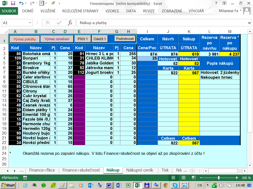 V tomto listu můžeme dále „zvyšovat komfort“ hospodaření s financemi. Je totiž velmi výhodné, pokud si můžeme hlídat velikost svých nákupů a neustále sledovat, jaký má návrh nákupu vliv na velikost rezervy a případně svůj nákup upravovat podle toho, jakou rezervu si chceme ponechat. Tohle přesně tento list umožňuje a dále pak také zde můžeme zapsat útratu po skutečném nákupu, neboť skutečný nákup se často od plánovaného značně liší. Tady je pak důležité, pokud budeme nakupovat něco jiného, než jsme měli v plánu, dodržet plánovanou velikost útraty.