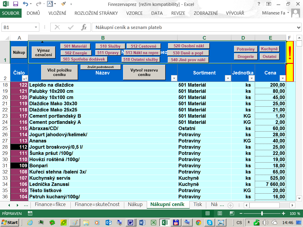 Je logické, že chceme-li plánovat nákup, musíme mít taky údaje o ceně a názvu příslušných položek. V této aplikaci k tomuto účelu slouží list: Nákupní ceník.